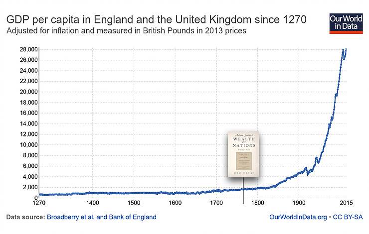 From Protestantism capitalism has taken the work ethic, but it has stripped away the moral aspects. As you can see from this graph capitalism and the industrial revolution has made our lives materially heaps better, loads better. But we aren’t happy.